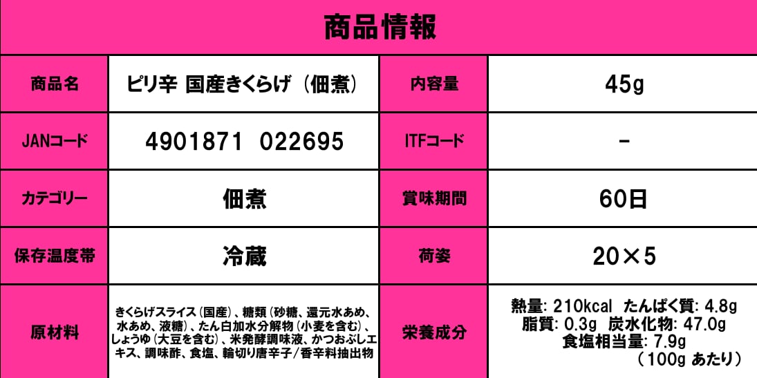テーマは「コリコリ食感 × ご飯がすすむ!」こだわりの国産きくらげのピリ辛佃煮です。温かいごはんにのせたり、おにぎりの具としてお楽しみください。麺類や冷奴、炒め物のアクセントとしてもおすすめです。きくらげは食物繊維たっぷり、そして低カロリーで栄養価も抜群。日頃、不足しがちなカルシウムや鉄分もしっかり補えます。昔ながらの製法で丁寧に炊き上げた職人の手作りの味をご家庭で味わえます。